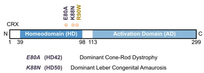 Two key mutations—E80A and K88N—occur in the HD region of CRX, leading to severe blinding diseases.