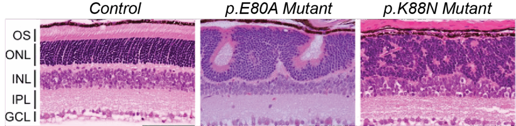 Introducing either p.E80A or p.K88N mutations to the HD region of CRX disrupts the layered structure of the retina, leading to severe visual deficits.